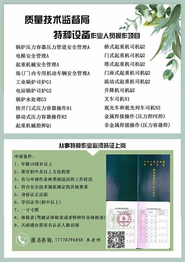 四川省質監局特種設備操作證:培訓考試報名熱線;177 7839 6858(微信同號),李老師  隨時報名,國網查詢,全國通用,高通過率。(全川40家合作機構和考試機構,方便快捷)